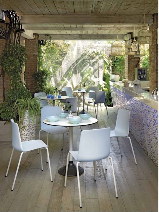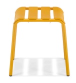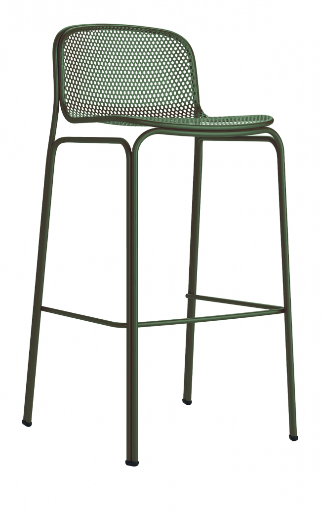 El respaldo del taburete, en la reconocible rejilla metálica, se ha rebajado respecto a las versiones de silla, para volverlo más práctico y de apariencia más ligera. Aunque es un producto orientado al uso en exteriores, gracias a su elegancia innata también se adapta perfectamente a ambientes interiores.