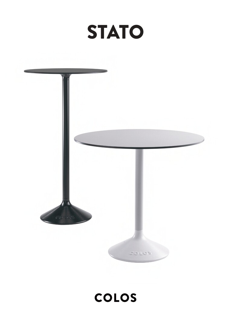 STATO A es una mesa alta de bar con un diseño clásico y minimalista, concebida para espacios colectivos donde los asientos no son necesarios o para los que se prefieren los taburetes altos, para un enfoque más informal.