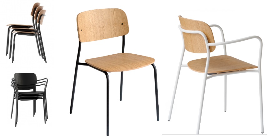 El asiento Daily 1 es apilable y cuenta con dos acabados para el estratificado curvo (roble natural y roble negro) y dos acabados para la estructura (blanco y negro). La gama también incluye otro modelo de silla, con brazos.