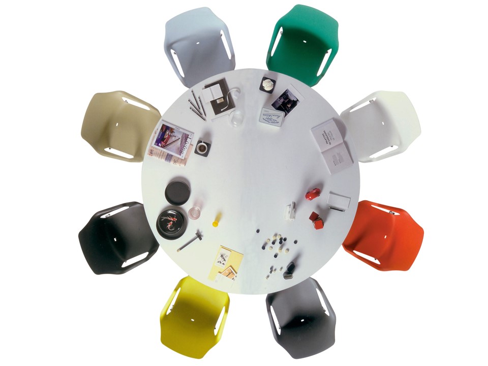 La mesas TA/1 se destacan para el top redondo en hoja de metal, disponible en dos diametros, hecho con una tecnica particular para que sea ligero y solido al mismo tiempo.
