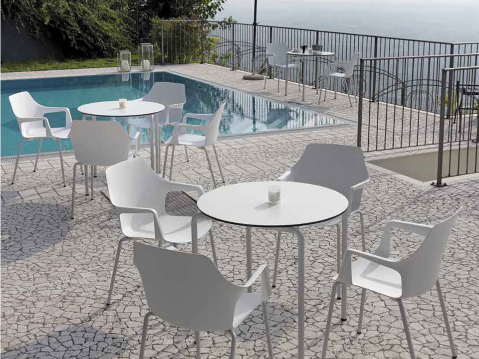 QU es una mesa minimalista y discreta, concebida principalmente para entornos al aire libre: la estructura de tubo metálico es de hecho autonivelante, por lo que es adecuada para colocar incluso en superficies algo irregulares. Es adecuada para ser colocada fácilmente en jardines, balcones y terrazas en la calle, así como en ambientes con pavimentos que no son totalmente planos.