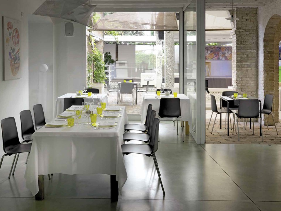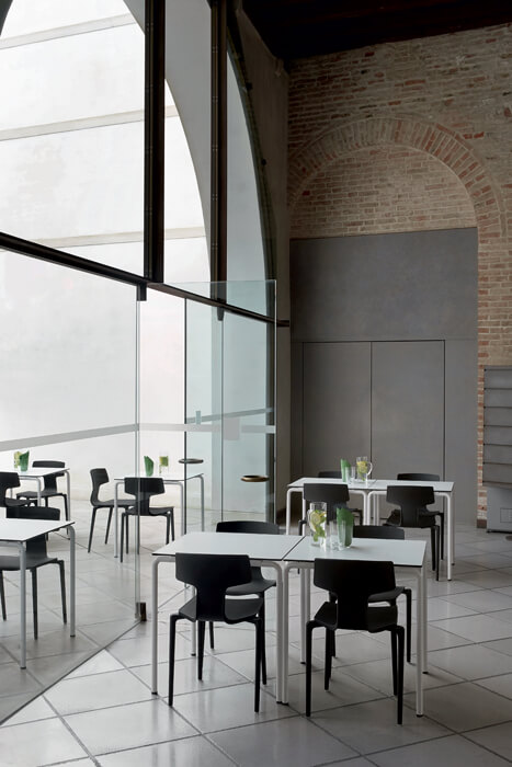 La versión rectangular de las mesas Alfiere fue creada específicamente para ambientes de bistró, donde la profundidad del sobre debe ser mayor que el ancho, para optimizar el espacio y, al mismo tiempo, garantizar el grado de comodidad adecuado.