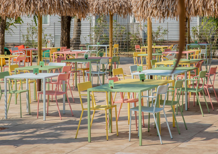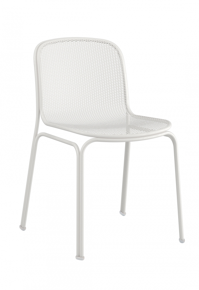 VILLA-GRAN 1 es una silla con estética contemporánea, inspirada en los asientos de exterior de las terrazas parisinas: La rejilla metálica, formada por una chapa estirada y preformada, se combina con cuatro elementos en tubo de acero, formando así una estructura ligera y a la vez sólida.