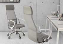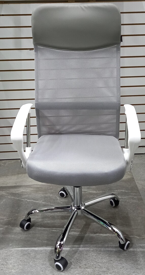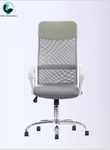 Sillon Ejecutivo, respaldo de malla alto, Asiento de tela microespacial, brazos futuristas, estrella cromada, rodajas negro con blanco