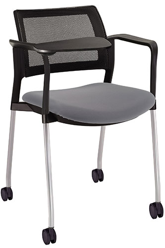 estructura: acero tubular de 7/8 "de diámetro, calibre 14; color gris, con rodajas giratorias tipo dual en color negro, con descansabrazos de polipropileno en color negro y con paleta lateral abatible en color negro fijada al brazo mediante un dispositivo. respaldo: en malla diseño ergonómico. asiento: hule espuma de poliuretano inyectado flexible con densidad de 60 kgs / m3 con retardante a la flama y alta resilencia. tapiz: respaldo en malla color negro y asiento en tela o vinilo al color de su elección de Nuestro catálogo, las tapas son en color negro.